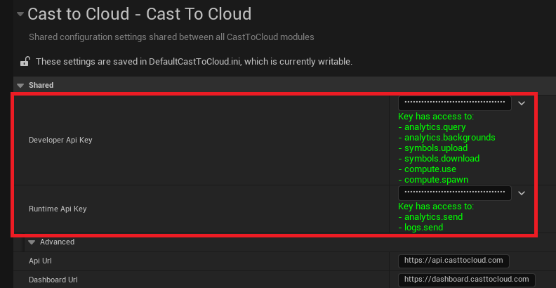 In the Project Settings tab, under the Cast To Cloud category, you should now see the Runtime API Key and Developer API Key fields pre-filled.